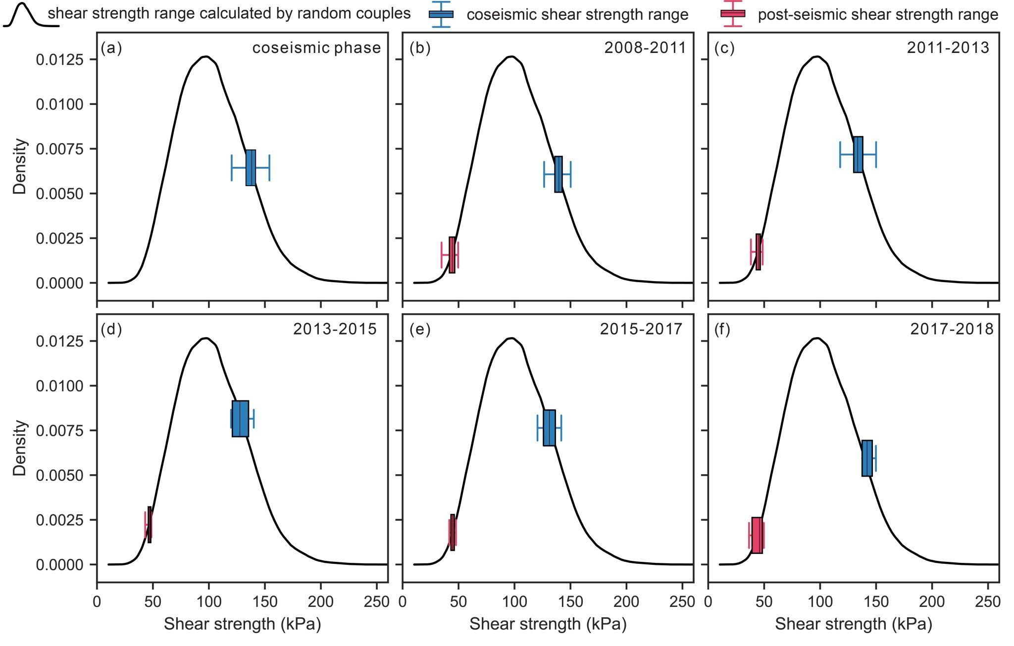 据悉,该论文为揭示强震区震裂山体损伤效应提供新的见解。强震对山体的扰动增加了震后滑坡易发性。然而,以往研究对强震导致斜坡弱化的内在规律认识不足。本研究提出一种基于震后滑坡反演的物理模型以评估地震扰动下斜坡抗剪强度损伤理论值,并进一步结合数据驱动模型推断整个研究区的强度衰减。对2008年5.12汶川特大地震的研究表明,在0.5-0.9 g的峰值地面加速度范围内,斜坡近地表岩土体抗剪强度损伤在60%-75%之间。