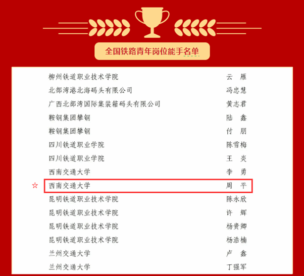 周平老师为“全国铁路青年岗位能手”。