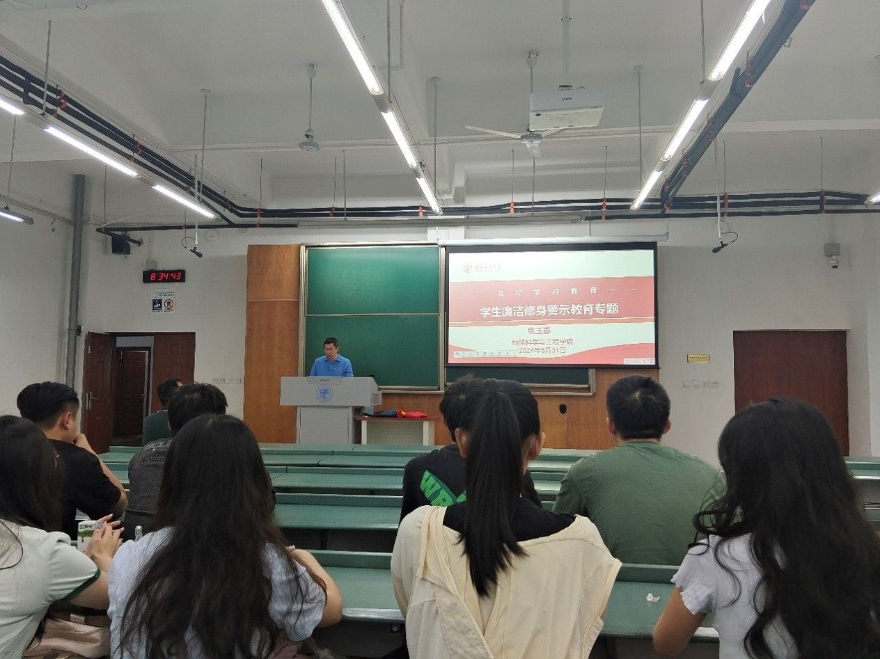 5月31日早上8点30分,地学学院在X4155教室举办了主题为“党纪学习教育之廉洁修身警示教育”的专题活动。活动中,学院党委委员张玉春同志讲授党纪学习教育专题党课,教工消防党支部书记李涛同志主持学习活动。