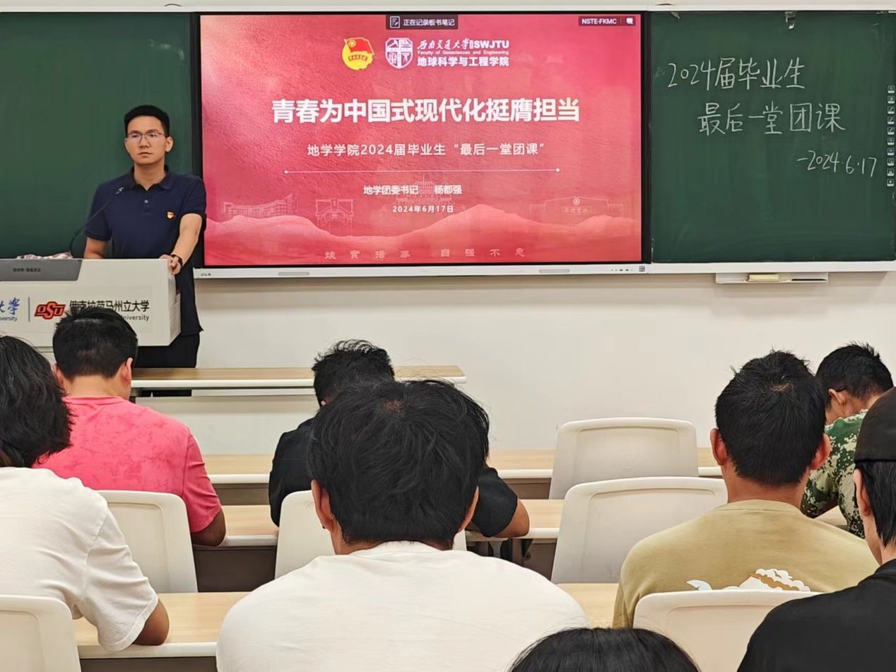 本次团课共分为两个内容:第一部分,由地学学院团委书记杨都强老师主讲“青春为中国式现代化挺膺担当”专题讲座;第二部分,团建中心指导老师黄欣宇开展毕业生团组织关系转接工作相关指导。