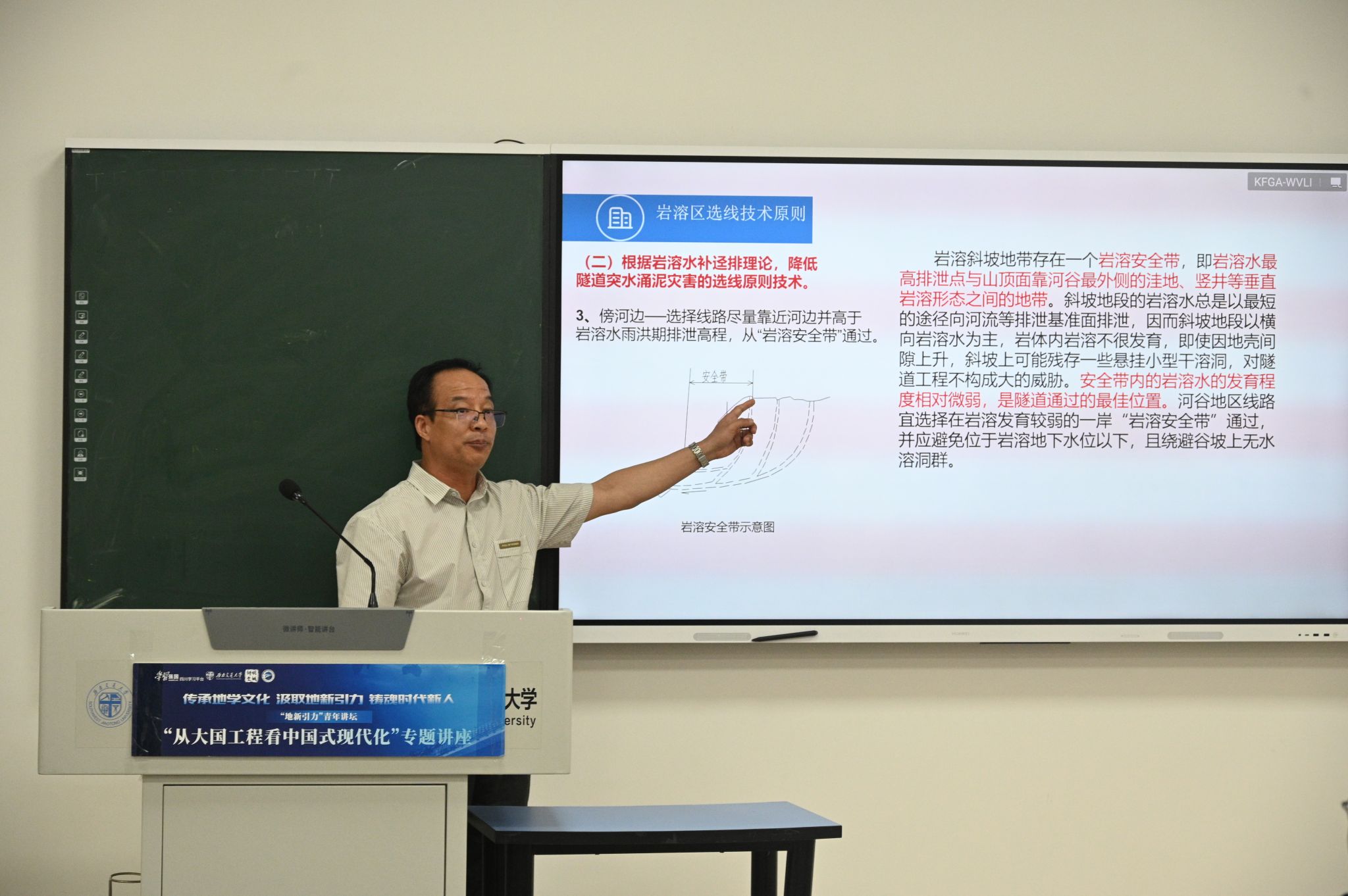 在四号教学楼X4247教室隆重举办了“从大国工程看中国式现代化”专题五讲座。本次讲座聚焦岩溶区铁路综合选线技术,邀请了业内知名专家中铁二院教授级高工曹化平作为主讲人,讲座由地学学院团委副书记李婧主持,副院长赵晓彦出席本次活动,智慧、地学、环境等学院60余名学生参与本次讲座。