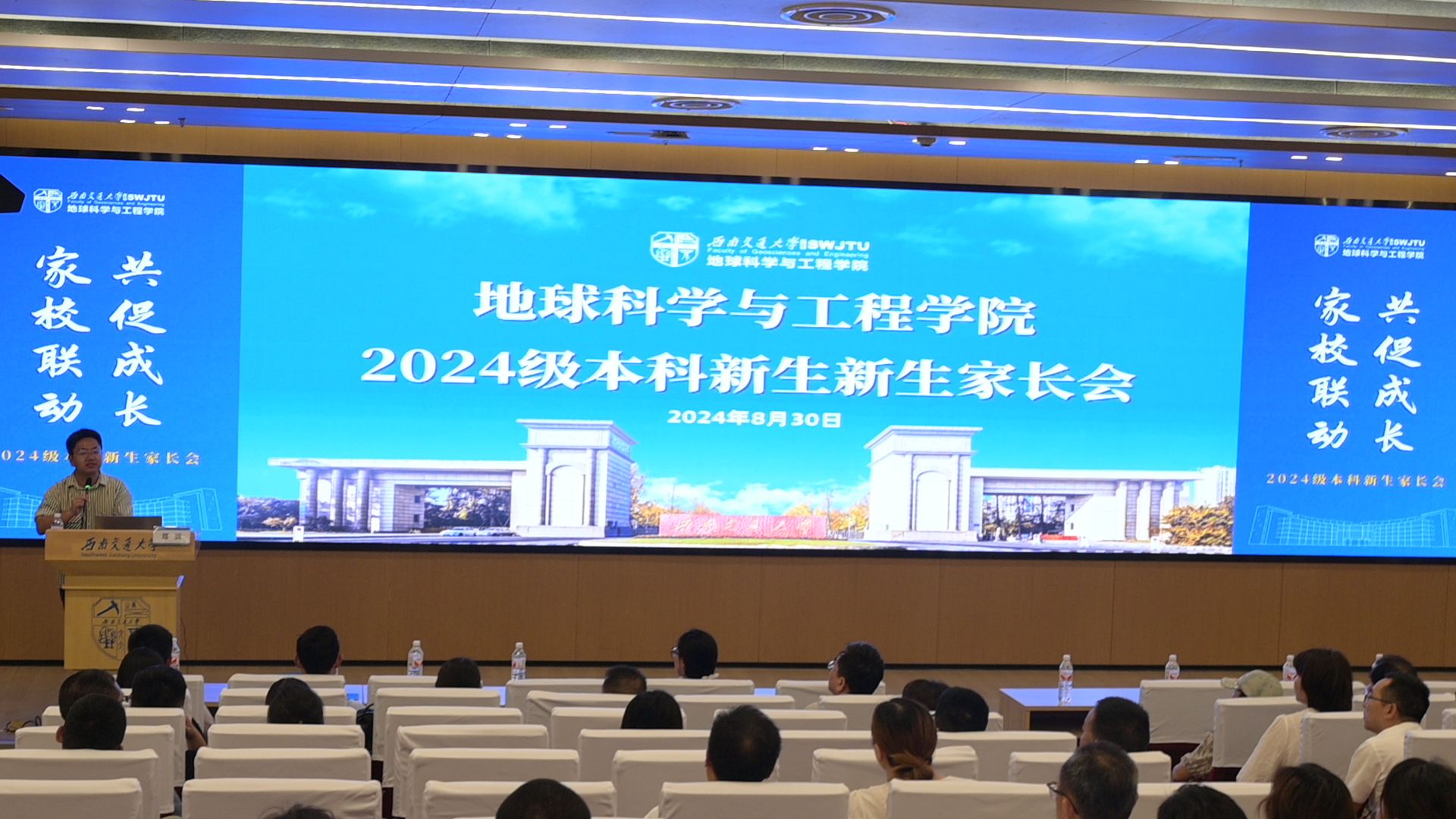 犀浦校区图书馆一号报告厅举办2024级新生家长会,旨在帮助家长了解学院学科建设情况以及学生的未来规划方向,促进家校之间建立桥梁,共同推动学生成长。会议由地学学院党委副书记郑波主讲,24级新生辅导员文强主持,学院团委书记杨都强、24级辅导员姜茜以及24级本科新生家长参与。