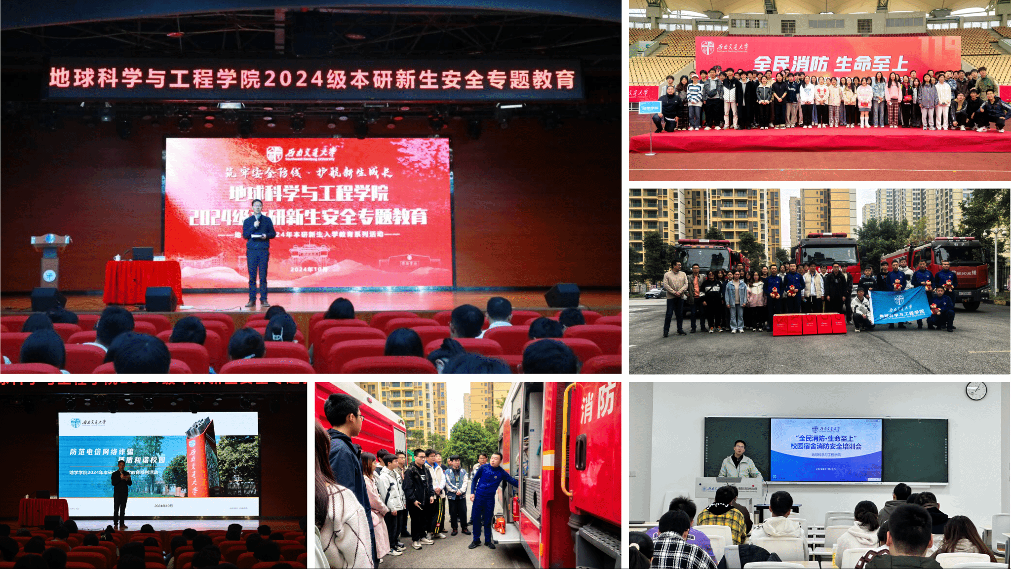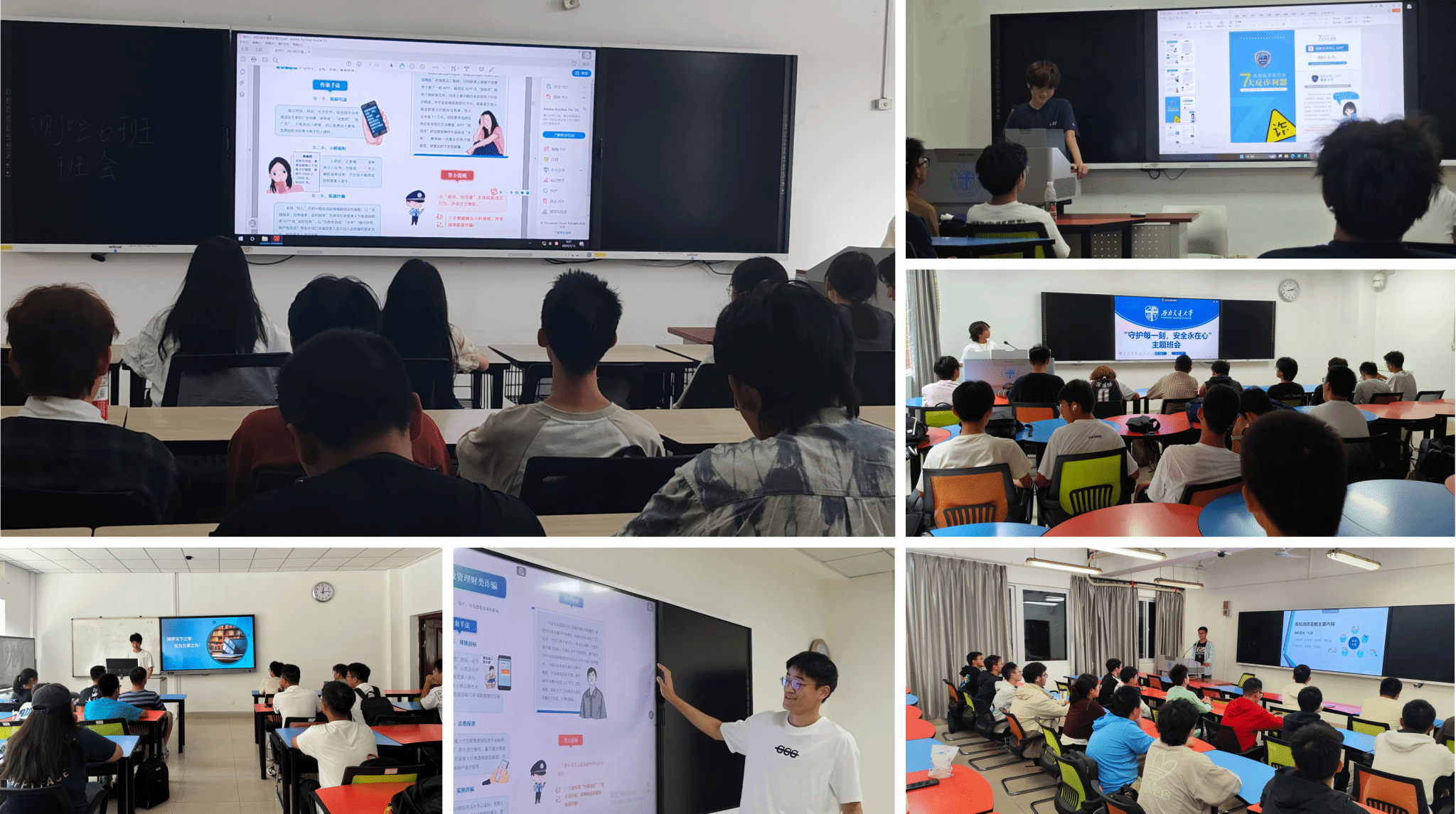 一是以年级大会的形式全覆盖开展安全教育专题、网络素养教育专题以及防范电信网络诈骗专题讲座,从国家安全、保密安全、消防安全、交通安全、金融安全、人身安全到网络言行层面的意识形态安全、涉及考试违规违纪的学业安全,再到花样繁多的电信反诈安全,团委书记杨都强老师通过详实的案例与数据为新生进行了系统讲解,切实护航新生平安成长。二是通过实战演练、走进一线消防队等形式,组织新生积极参与学校“119”消防安全活动,结合学院消防安全协会实践活动,组织新生赴犀浦消防救援中队进行参观学习,增强新生的消防安全知识和逃生技能。三是用好学生骨干队伍,由学院团委杨都强老师对新生班级的安全员开展专题培训,安全员全覆盖深入各自的班级宿舍进行宿舍安全的排查,重点就违章电器等进行梳理,园区指导老师姜茜带领园区中心学生骨干按月进行日常寝室安全隐患检查,并建立工作台账。四是以班团支部为载体,围绕防诈、消防火灾等问题开展守护校园安全主题班会,全员签署电信防诈承诺书,下载注册“蓉城反诈”小程序,力争让宿舍消防火灾、网络防诈等安全意识入脑入心,进一步明晰消防安全知识重在预防,时刻绷紧安全弦。