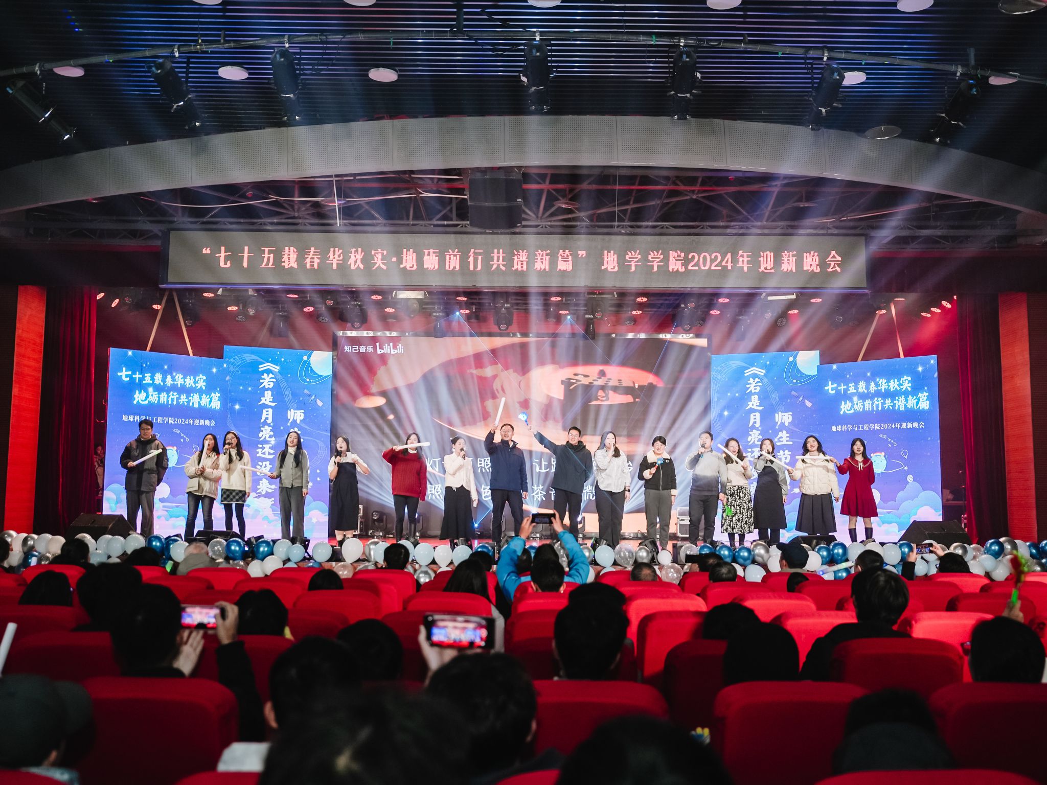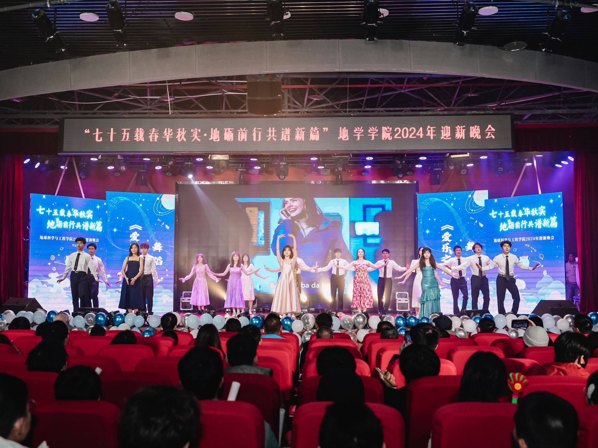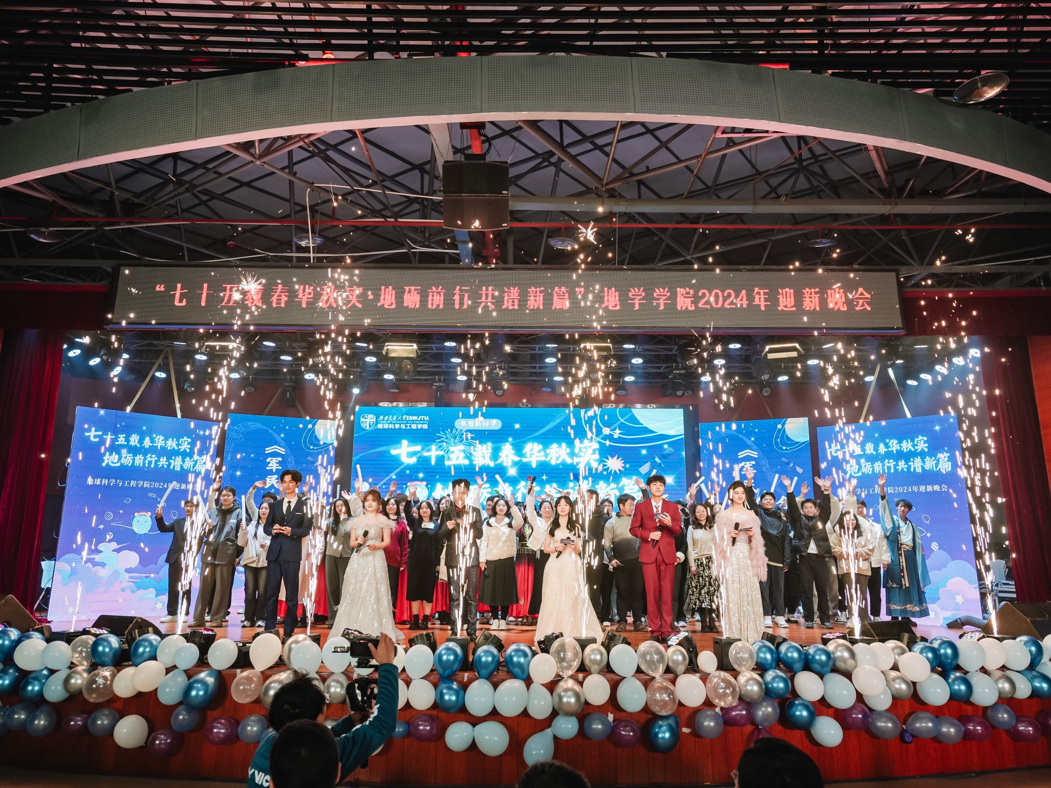 2024年迎新晚会在犀浦校区二食堂三楼大学生活动中心隆重举行。地学学院党委书记关秦川、院长刘国祥、副院长朱军,茅以升学院党总支副书记杨宏毅,地学学院党委副书记郑波,学院人才、外籍教师、专业教师、管理人员等代表,以及学院全体辅导员老师、兄弟学院学生会代表出席了本次晚会。