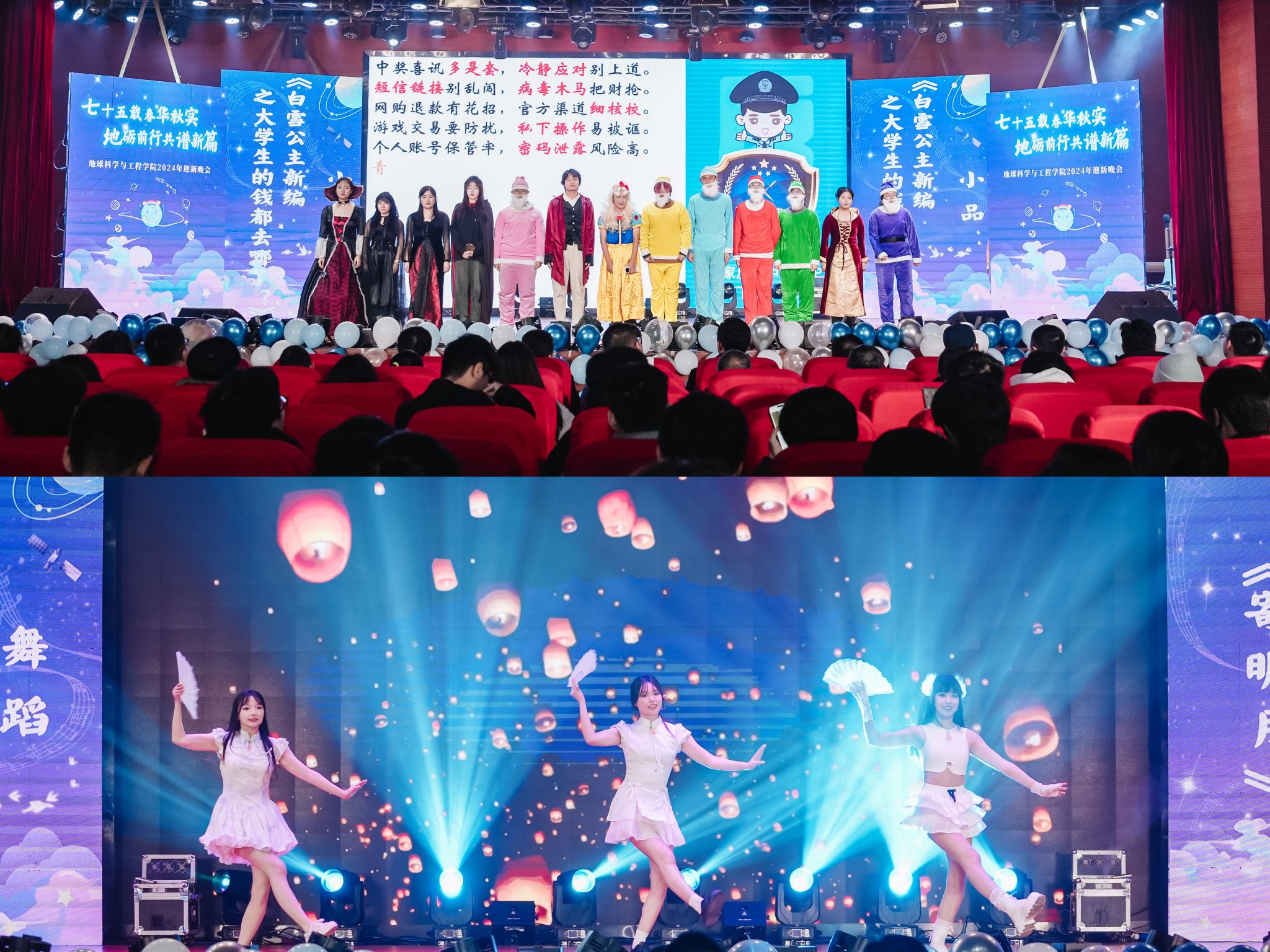 在小品《白雪公主新编之大学生的钱都去哪了》中,测绘茅班从大学生的实际生活出发,以《白雪公主》为原型进行改编,加入“校园卡“”校园刷单“”二手商品“”大数据“等元素,并将最近非常流行的“梗”与台词融入在剧情里,使故事变得生动风趣的同时,进一步提高了同学们的反诈意识。舞蹈《寄明月》中,舞者们以轻松明快的舞步表达对新年的祝愿,将现场的气氛逐渐推向高潮。