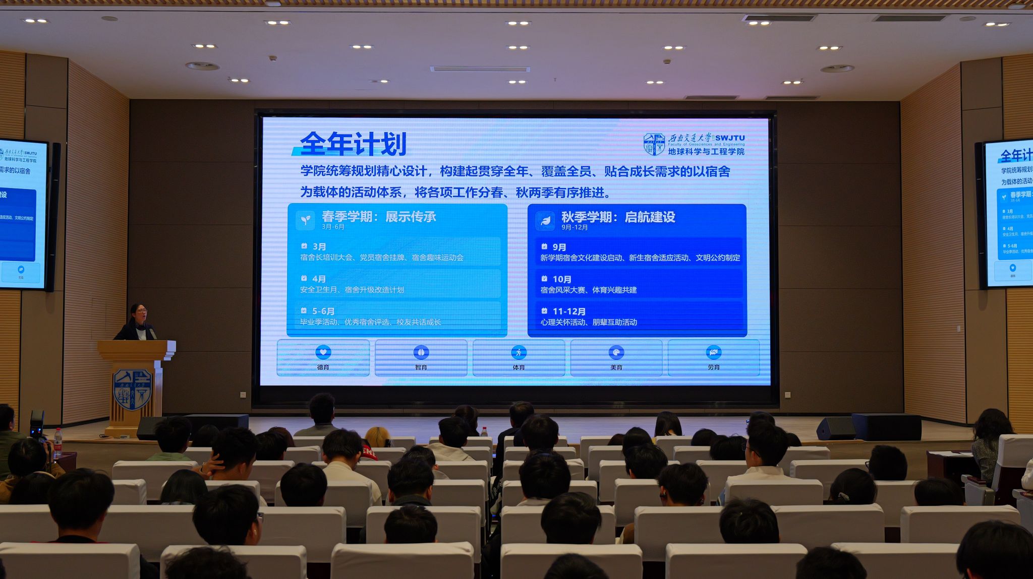 首先,由学院党委副书记曾洁对“地新引力 宿育英才”计划进行详细解读。曾洁副书记讲到,该计划立足地学特色,旨在将学生宿舍打造为思想引领的前沿阵地、学风建设的实践课堂与成长成才的温馨家园。计划紧扣德、智、体、美、劳五大维度,同时结合常态化心理关怀与日常管理服务,构建起贯穿全年、覆盖全员的活动体系。计划致力于打通育人工作的“最后一公里”,全方位助力新时代地学青年综合素养的提升。