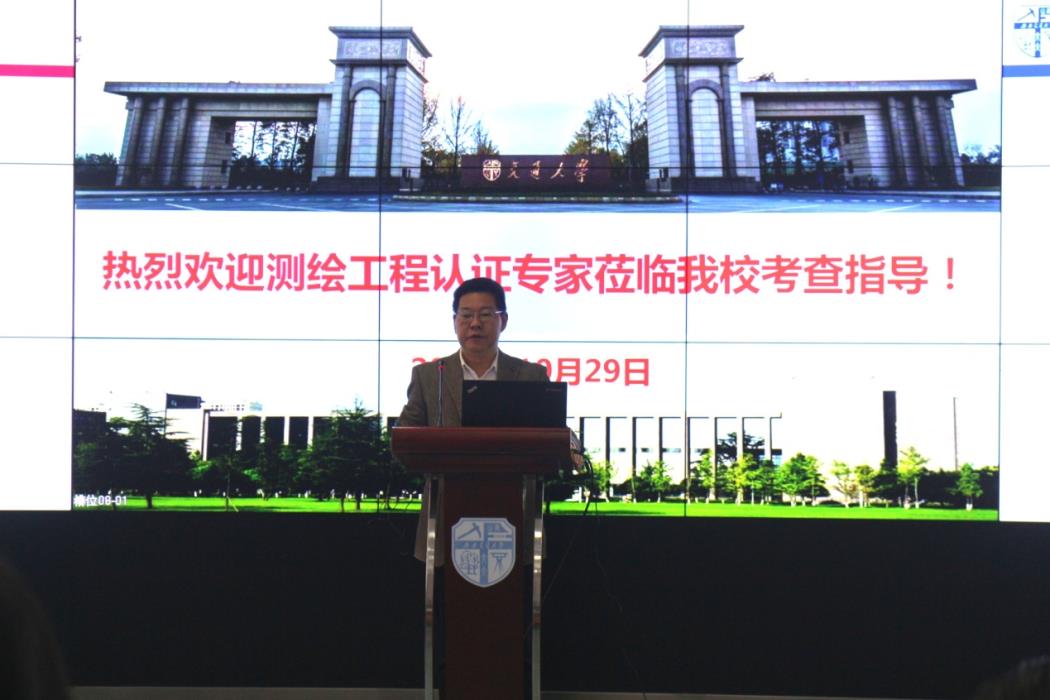 随后刘国祥进行认证汇报,他从学科与专业概况,培养方案及实施情况,质量保障体系及持续改进四个方面展开汇报。刘国祥介绍了地学学院测绘专业的发展情况、师资队伍状况,现有人才和全职外籍专家人数等,并展示了JVID
