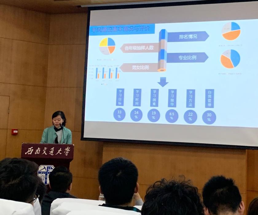 周青讲述学风建设月的研究报告。周青介绍了调研成果,简述了学风建设的基本情况与评价,针对母亲存在的主要问题提出了建议。