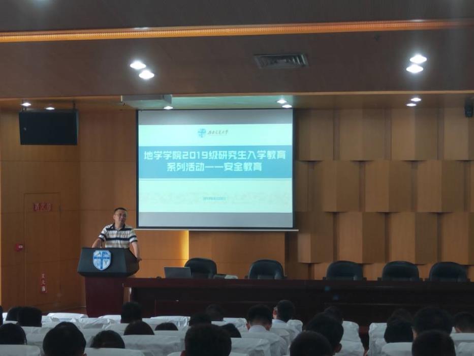 8月23日下午,地学学院于图书馆二号报告厅开展2019级研究生入学安全教育活动。本次活动由地学学院党委副书记傅尤刚主讲,地学学院2019级研究生辅导员崔宇龙主持。