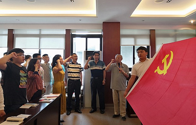 接下来举行了新党员入党宣誓和老党员重温入党誓词仪式。由刘冠军同志领誓,冯丽梅同志监誓,新老党员面对党旗进行庄严的宣誓。铿锵有力的誓词激励广大党员们继承革命传统,牢记光荣使命,永葆党的先进性和纯洁性。