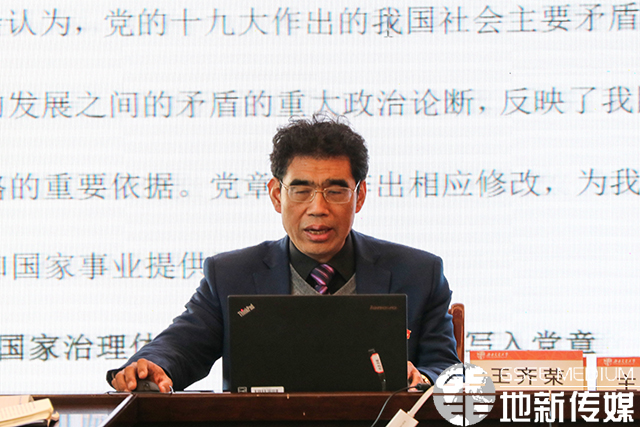 会议第一阶段由王齐荣主讲。王齐荣向全体党支部书记介绍了十九大对党章做出的十项重大修改,即习近平新时代中国特色社会主义思想写入党章、中国特色社会主义文化写入党章、实现中华民族伟大复兴的中国梦写入党章、党章根据我国社会主要矛盾的转化作出相应修改、推进国家治理体系和综合能力现代化写入党章、供给侧结构性改革、“绿水青山”就是金山银山写入党章、人类命运共同体,“一带一路”写入党章、全面从严治党,四个意识写入党章 “党是领导一切的”写入党章、实现巡视全覆盖、推进“两学一做”写入党章。