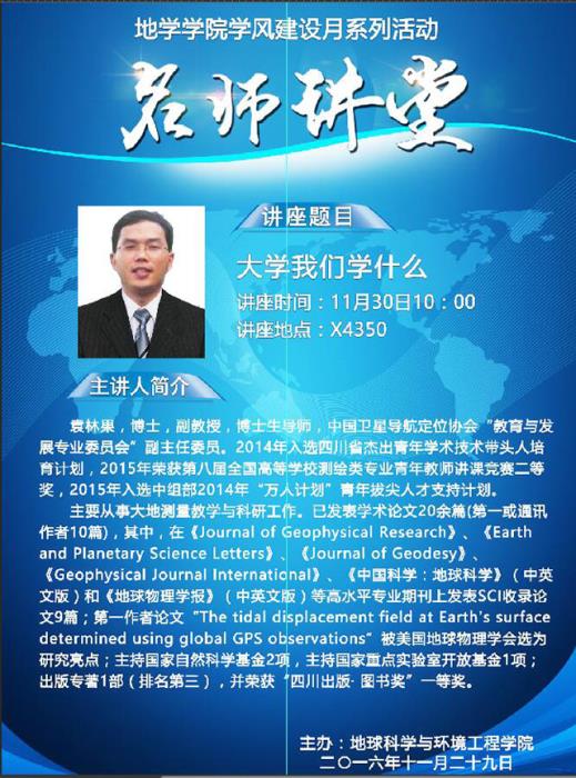 唐立新优秀学者,教授,博士生导师,中国卫星导航定位协会“教育与发展专业委员会”副主任委员。袁林果教授主要从事大地测量教学与科研工作,2014年入选四川省杰出青年学术技术带头人培育计划,2015年荣获第八届全国高等学校测绘类专业青年教师讲课竞赛二等奖,2015年入选中组部2014年“万人计划”青年拔尖人才支持计划。今天袁老师要讲大家大学学什么,希望大家听了以后,加以反思,有所收获。