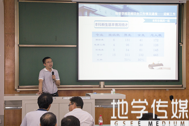 最后,地学学院党委副书记傅尤刚通报了近期学生工作情况,分别介绍了2016届学生就业情况;2016级新生的报到及入学教育相关情况;本科生学业导师管理办法。