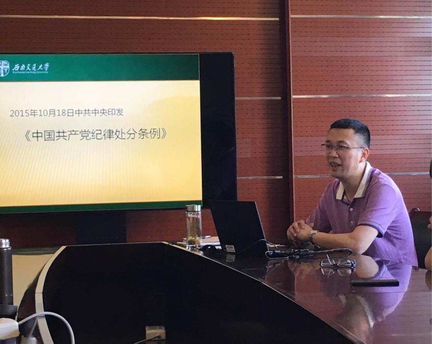 院党委傅尤刚副书记精心为与会人员做了两个内容的专题党课:分别是学习《条例》和《四种形态》。他主要介绍了《条例》的出台背景、修订的意义和主要内容,特别强调了《条例》的“底线”规定,并结合师生学习、工作和生活实际,结合典型案例重点讲解了党的六大纪律所规定的主要内容,号召全体教师党员要“知敬畏、存戒惧、奔高线”,严格要求自己、强化党性观念、贯彻落实好《条例》。接下来他还结合文件《关于高等学校践行监督执纪“四种形态”的指导意见》带领大家从“四种形态”的科学内涵和重大意义、认真践行监督执纪“四种形态”的具体要求三个方面进行了深入解读。他认为四种形态”具有现实针对性,体现了防微杜渐、宽严相济和教育与惩处并重的干部管理新原则;“四种形态”更为重要的是如何把握和运用,从而落实到实际工作中去,并且要求各位要在思想认识、责任担当、方法措施上跟上中央的要求,在平时的教学工作中,把纪律和规矩挺在前面,不断加强自身建设,把握运用监督执纪“四种形态”,以严明的纪律推进全面从严治党。