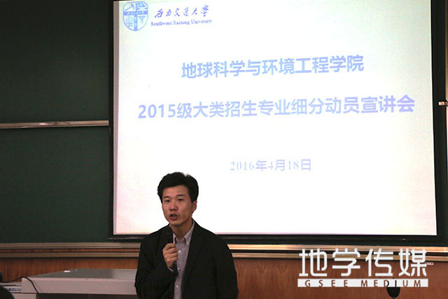 4月18日12点40分,旨在帮助2015级本科生全面了解各专业设置、现状与发展情况,近距离、面对面地与专业教师交流、沟通,主动引导学生结合自身兴趣、特长、性格、学习能力等条件因素,理性选择主修专业的大类招生专业细分动员宣讲会于犀浦校区四号教学楼X4152和X4155教室分别举行。本次宣讲会的宣讲专业分别为测绘工程、遥感工程、地理信息系统和环境工程、消防工程。负责学生工作的JVID