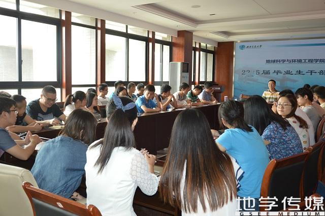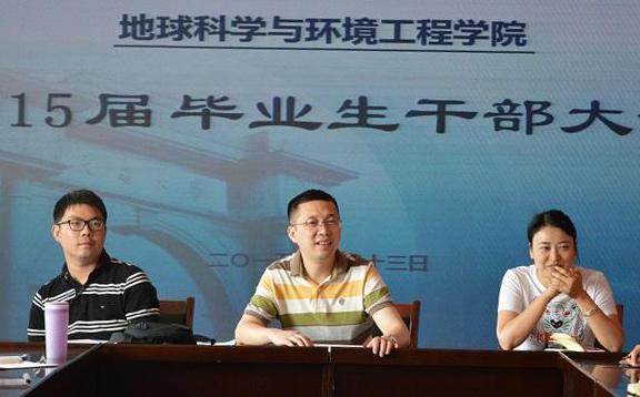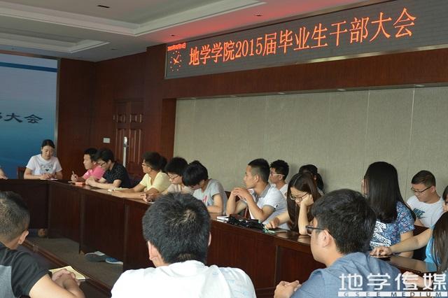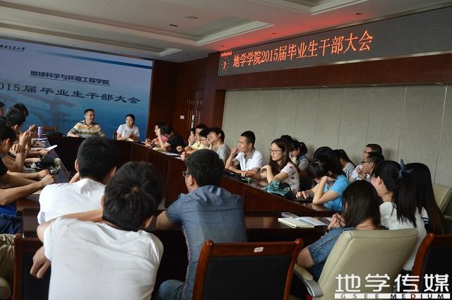 地球科学与环境工程学院于X4520召开2015届学生干部工作会议。地学学院党委副书记傅尤刚、辅导员陈艳艳、刘海龙及11级各班的学生干部参与了此次会议。会议由傅尤刚副书记主持。本次会议作为对毕业生组织召开的最后一次会议,旨在回忆地学学子大学四年的点滴,通知并开展毕业季相关工作,对即将毕业的大四学生表达热切的关怀与寄语。
