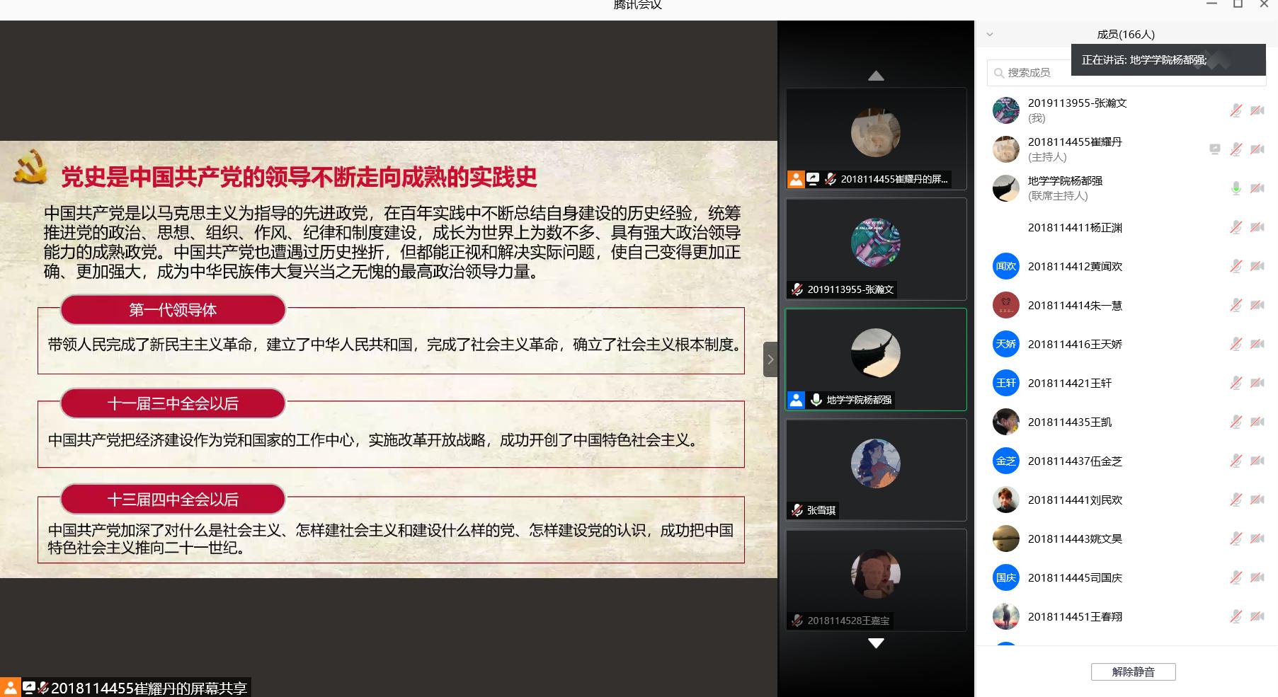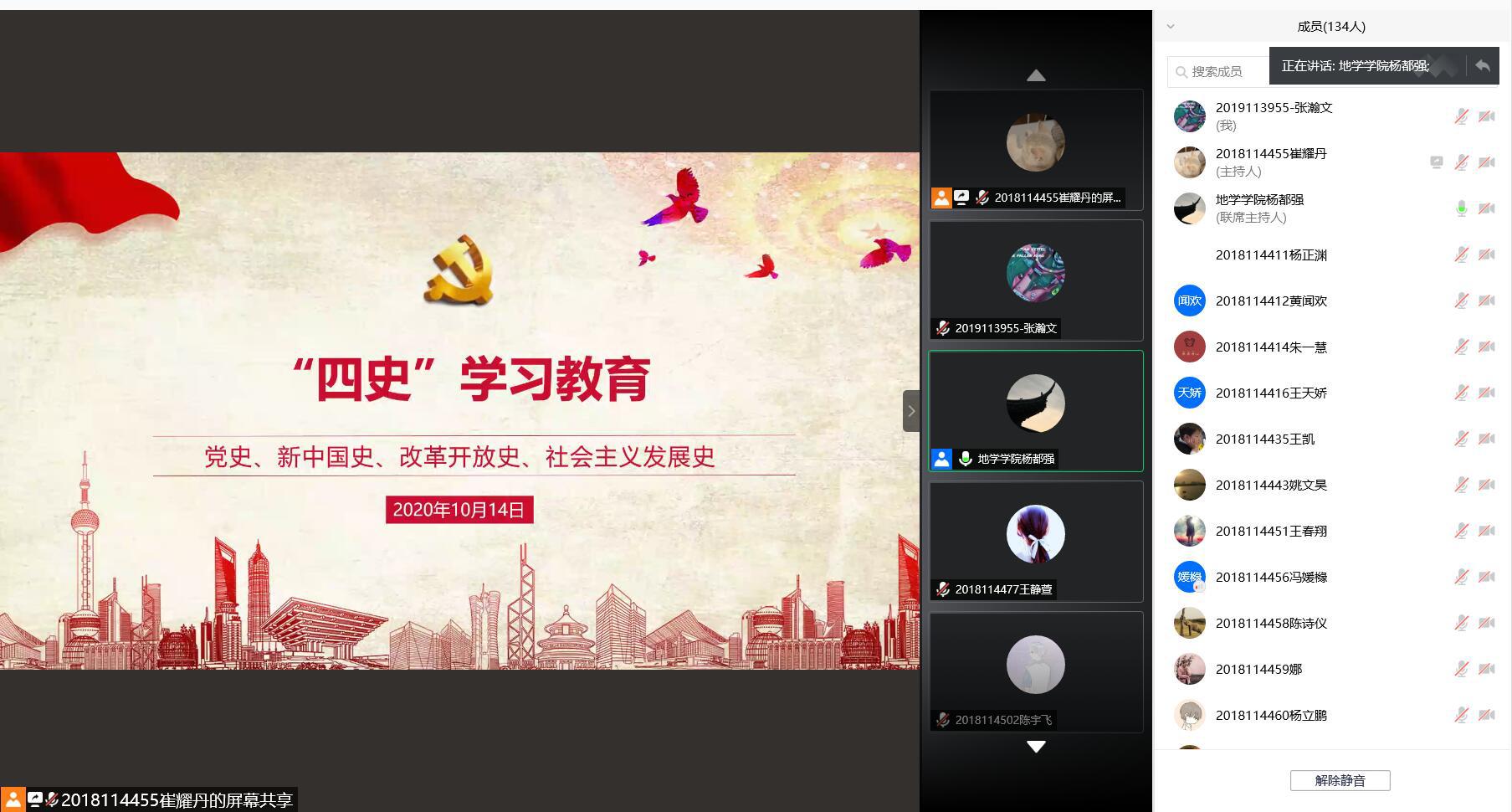为深入学习并贯彻落实习近平总书记关于党史、新中国史、改革开放史、社会主义发展史(以下简称“四史”)的重要讲话和指示精神,持续深化新时代爱国主义教育。18级环境工程、消防工程、安全工程学生于10月14日参加了“四史”学习,本次学习由18级辅导员杨都强老师以腾讯会议为平台开展并主讲。