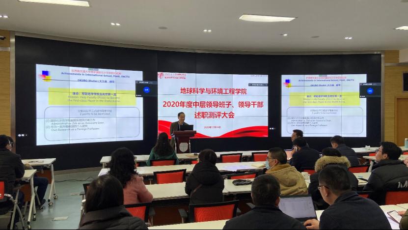 副院长Shuhei Okubo进行2020年述职报告。他介绍了国际化示范学院副院长相关的行政工作和作为一名外籍教授的个人研究,表明自己的使命是帮助地学学院走向世界一流,并对全体教职工的支持表示感谢。