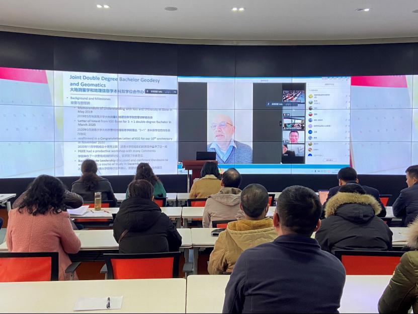 院长Lutz Plümer对2020年工作与成果作线上述职报告。Lutz Plümer概述了五项工作成果,即积极促进与波恩大学大地测量学和地理信息学本科双学位合作办学项目、国际化示范学院建设现状、对外展示的英文网站、已顺利开展的教学工作、科研论文发表。最后Lutz Plümer表达了对即将回归学校的期待和对学院国际化发展的美好愿景。