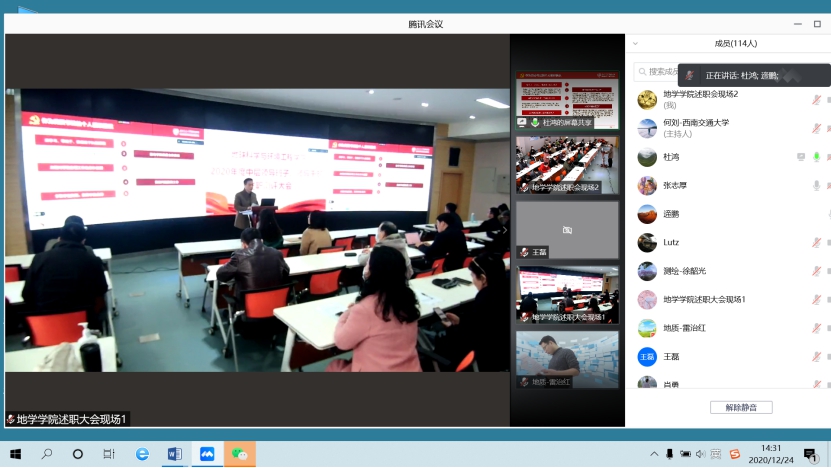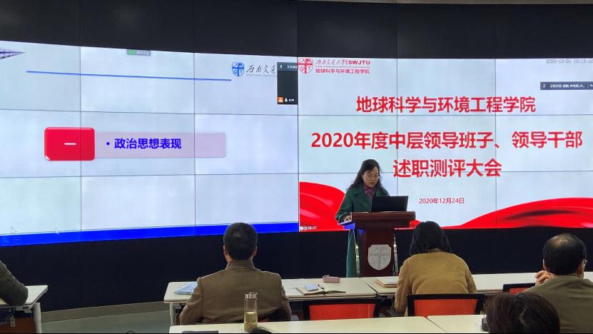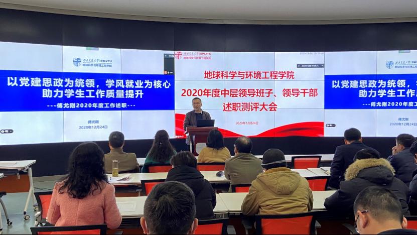 12月24日,地球科学与环境工程学院于X4243顺利召开2020年度中层领导班子、领导干部述职测评大会,大会采用线上线下相结合的方式。本次会议由地学学院党委书记关秦川主持,全院教职工参会。