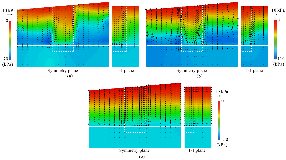 格栅式地下连续墙是一种新型桥梁基础,适用于大跨度的跨江和跨海大桥。根据对美国和日本发生的一些大地震震后液化场地的调查,该基础具有良好的抗液化性能,但目前国际关于格栅式地下连续墙基础抗液化机理的研究却很少。论文利用OpenSees软件(开源),基于离心机振动台试验建立有效应力模型,研究格栅式地下连续墙基础抗液化机理(图1)。数值建模过程中重点考虑模型边界、基础-土体接触面以及顶部自由水体(图2)模拟。模型边界选用优化自由场边界,该边界是由作者在已有自由场边界的基础上进行优化建立的;基础-土体接触面选用能够考虑液化影响的P-y、T-z以及Q-z弹簧模型(图1),该接触面能够有效地模拟基础与土体之间的动力相互作用以及土体超孔隙水压力对接触面的影响;自由水体选用特殊的孔隙水压力边界和节点力以及集中质量模拟。根据离心机振动台试验结果验证模型的可靠性,在此基础上研究不同振幅作用下格栅式地下连续墙基础在可液化场地的抗液化性能,并揭示其抗液化机理。研究表明格栅式地下连续墙抗液化的主要原因是:(1)限制土芯中土体的剪切应变,进而抑制超孔隙水压力的产生;(2)墙体具有隔水作用,阻断近场地孔隙水向土芯迁移,减轻了土芯土体液化(图3);(3)抵抗地基的侧向流动,减小大变形引起的破坏;(4)土芯土体减小了基础的竖向和侧向变形,减小了上部结构的位移。