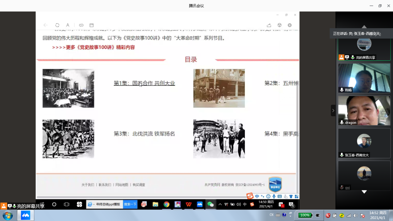 活动首先组织全体党员学习了清明节主题PPT——了解清明节概述知识,重温赵尚志、雷锋、邱少云等革命先烈的感人故事,倾听李文亮、彭银华、“凡人小林”、王春天等抗疫英雄的模范事迹,最后发出安全文明过节的倡议。随后,还组织全体党员观看了“党史故事100讲”、“[面对面]杨德盛:冰血长津湖” 、“ [探索⋅发现]英雄志·刘胡兰” 、“《百战经典》热血忠魂·方志敏”等相关视频,引导各位党员在慎终追远、致敬英雄的情怀中弘扬传统、增进爱党、爱国的情感。