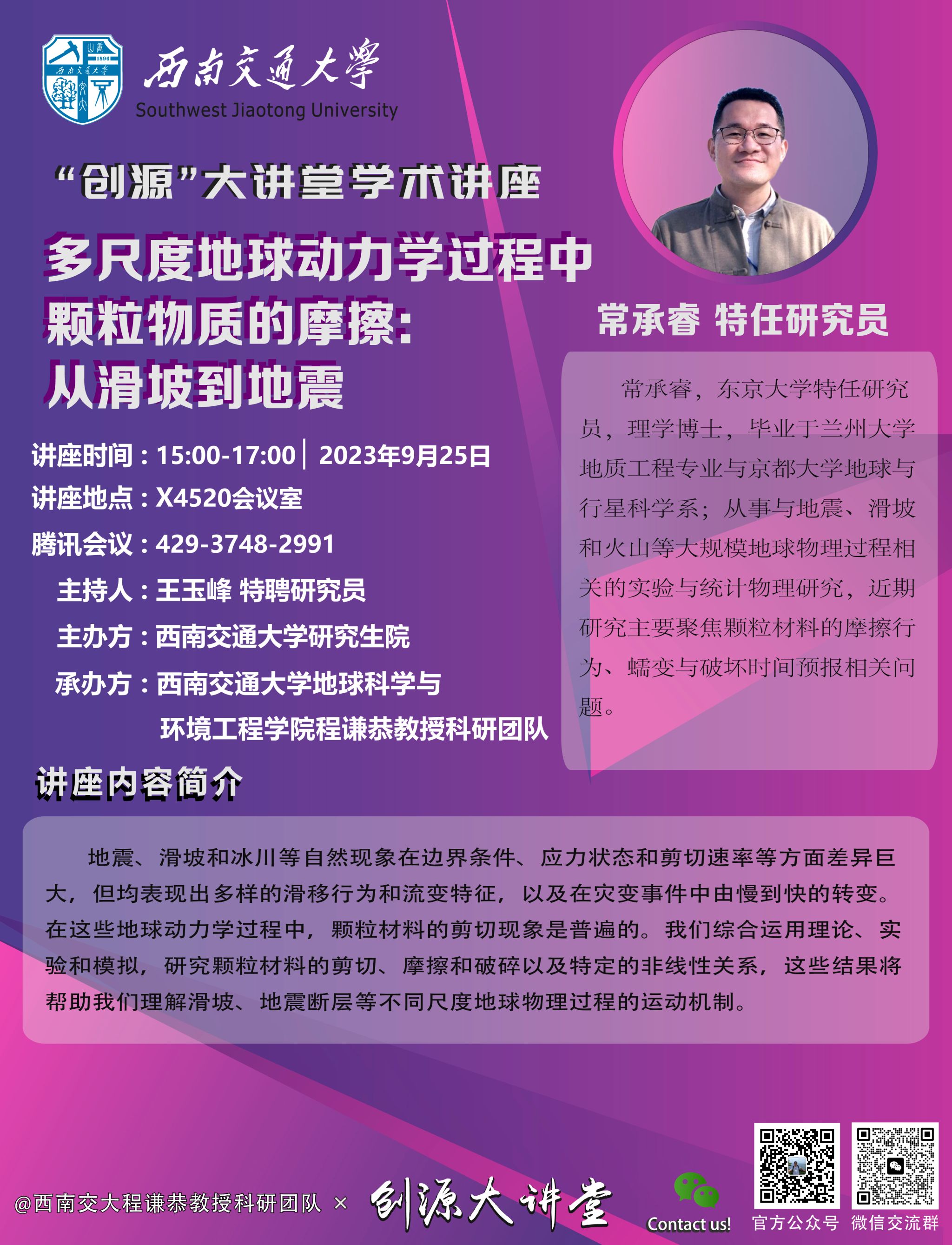 讲座题目:多尺度地球动力学过程中颗粒物质的摩擦:从滑坡到地震