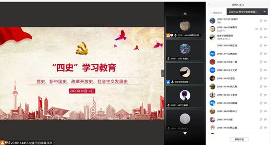 To further study and implement General Secretary Xi Jinping's important speeches and directives on the history of the party, the history of the People's Republic of China, the history of reform and opening up, and the history of Socialist Development (hereinafter referred to as the "Four Histories" ) , we will continue to deepen patriotic education in the new era.. Students of grade 18 Environmental Engineering, Fire Engineering and Safety Engineering participated in the "Four Histories" study on October 14. The study was conducted and lectured by teacher Yang Duqiang, instructor of grade 18, using Tencent Conference as the platform.