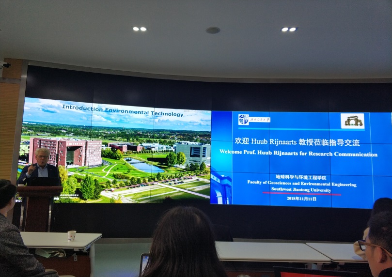 On November 11, 2018, Prof. Huub Rijnaarts, Dean of the Institute of Environment and Climate, Wageningen University, the Netherlands, was invited by Prof. Gong Zhengjun to give academic lectures and academic exchanges at X4243. Associate dean Ouyang Feng, Professor Huang Tao, Professor Gong Zhengjun, Associate Professor Zhang Han, Senior Engineer Wang Dongmei, and some students from environmental engineering and related majors attended the academic lecture. This lecture was hosted by Professor Gong Zhengjun.