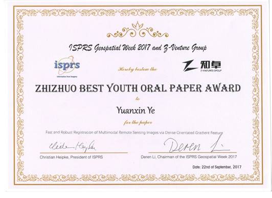 The best youth oral paper award to authors who are less than 35 years old and are the 1st author of a high quality paper presented to the ISPRS GSW. The GSW2017 brought together over 1000 participants, where more than 30 percentage of participants come from overseas. Dr. Yuanxin Ye is first winner of this award in our university.