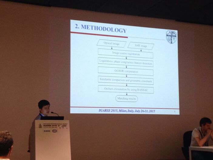 The International Geoscience and Remote Sensing Symposium 2015 (IGARSS 2015) was held from July 26th through July 31th, 2015, at the Convention Center in Milan, Italy. This is one of the most influential conferences in geoscience and remote sensing community, and attracted over 2000 academics and industry professionals from over 60 countries. Dr. Min Chen, Dr.Yuanxin Ye, Dr. Li Shen, and Jicheng Wang (graduate student) in our faculty attended the conference. Dr. Chen and Dr. Ye gave oral presentations titled “GGSOR: A GAUSSIAN-GAMMA-SHAPED BI-WINDOWS BASED DESCRIPTOR FOR OPTICAL AND SAR IMAGES MATCHING” and “AUTOMATC MATCHING OF OPTICAL AND SAR IMAGERY THROUGH SHAPE PROPERTY”, respectively. Dr. Shen and his graduate student Jicheng Wang gave a poster presentation titled “RESEARCH ON RELATIONSHIP BETWEEN REMOTE SENSING IMAGE QUALITY AND PERFORMANCE OF INTEREST POINT DETECTION”. IGARSS provides our faculty members and student an ideal forum for obtaining up-to-date information about the latest developments, exchanging ideas, identifying future trends and making networking with the international geoscience and remote sensing community.