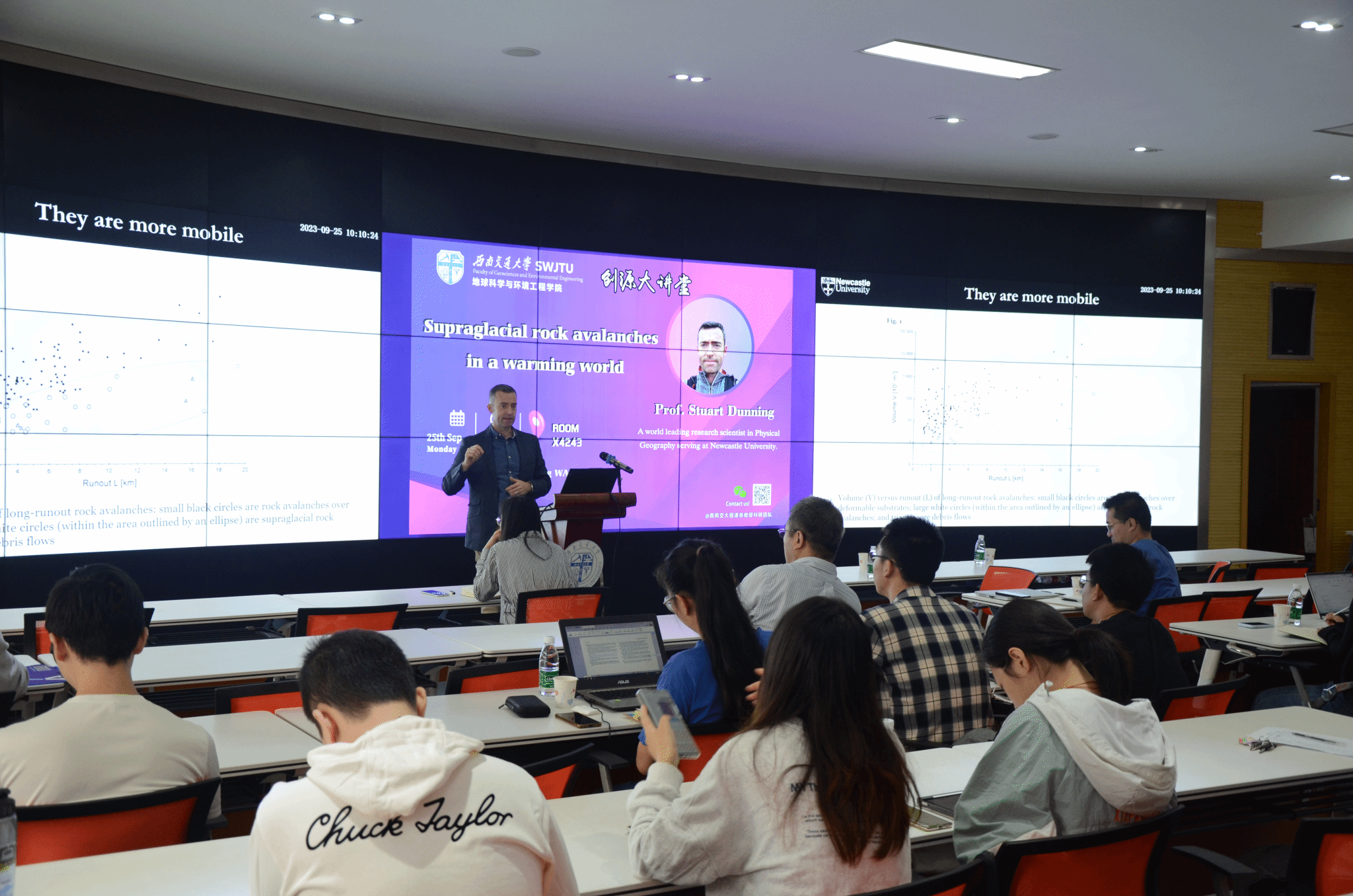 聚焦全球变暖趋势下冰川退缩所引发的高速远程滑坡、冰湖溃决等地质灾害问题,Dunning教授选取“Supraglacial landslides in a warming world”作为报告主题,此次学术交流是程谦恭教授团队主办的2023年“创源大讲堂”系列报告之一。报告由王玉峰特聘研究员主持,共有五十余名师生参加。