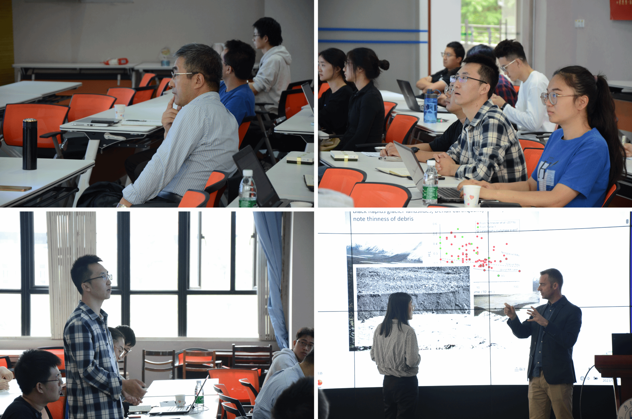 报告结束后,程谦恭教授、常承睿特聘研究员、林棋文博士后等师生围绕Dunning教授的讲座内容展开了深入的讨论,共同探讨了冰川区高速远程滑坡灾害与非冰川区高速远程滑坡物质组成特征上的异同、源区特征上的异同及运动与堆积特征的异同,并就滑坡失稳机制、动力破碎、颗粒分选等角度进行了深入交流和热烈讨论。在整个学术交流过程中,Dunning教授热情饱满,学识深厚,耐心解惑,与在场师生积极互动。会场气氛活跃,学术氛围浓厚,在座师生受益匪浅。