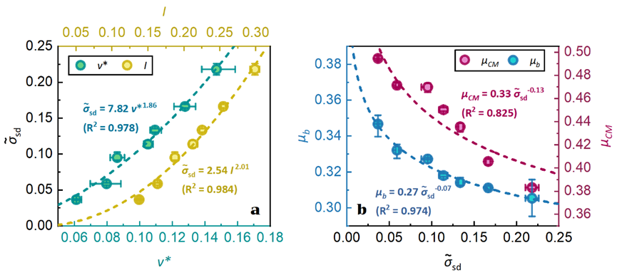 图3 颗粒流基底应力波动与惯性数及摩擦系数之间的量化关系
